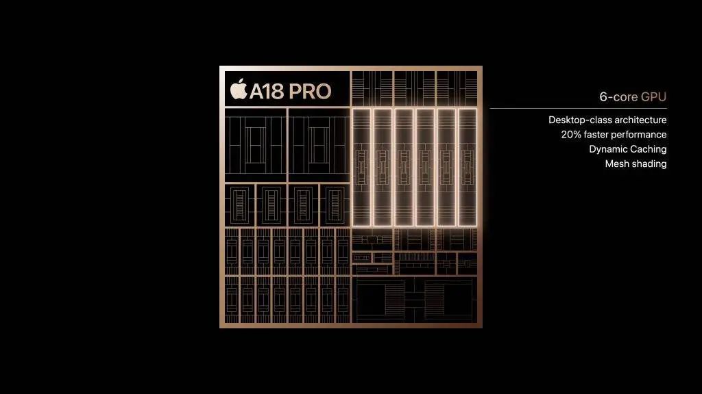 A18 Pro 保持了 6 CPU 核 +6 GPU 核的配置。6 核心的 GPU,比起 A17 Pro 性能提升 20%,硬件加速光追能力最快可达上一代两倍,要知道 A17 Pro 的光追性能已经足以运行大型主机级别游戏。