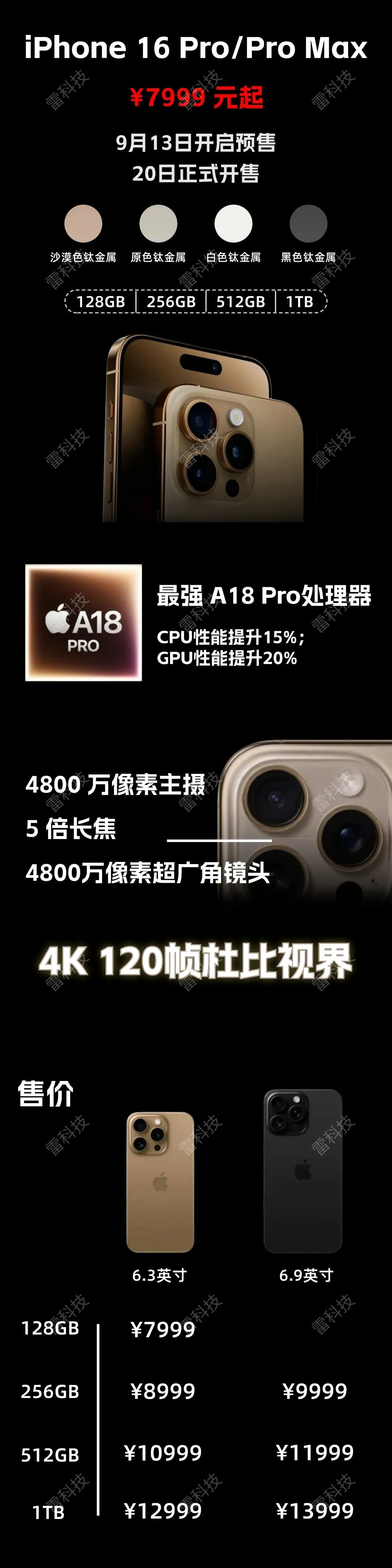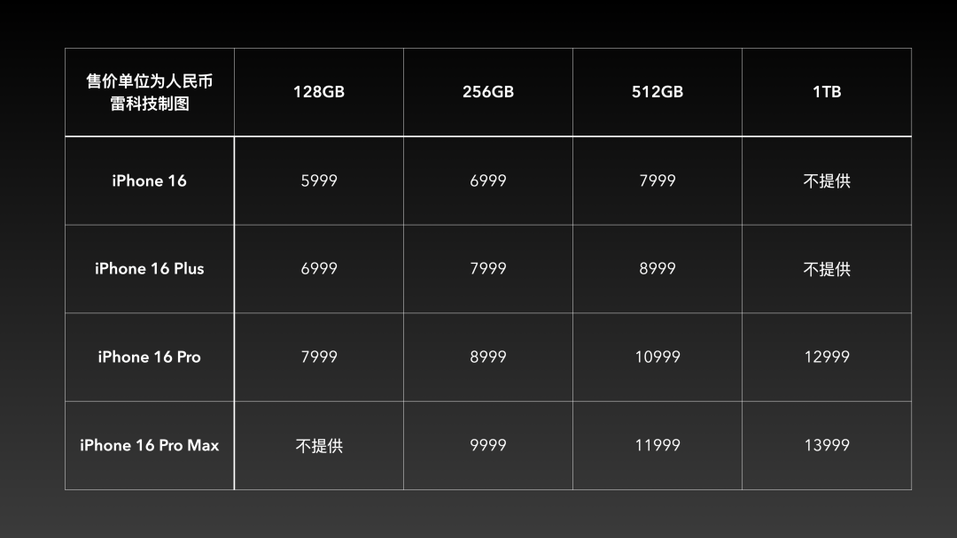 iPhone 16 提供 5 种新配色(群青色、深青色、粉色、白色、黑色),三种存储空间版本(128GB、256GB、512GB),起售价格为 5999 元(iPhone 16 128GB),最高价格为 9999 元(16 Plus 512GB), 9 月 13 日晚上 8 点开放预购,20 日发售。雷科技将第一时间评测,敬请期待。