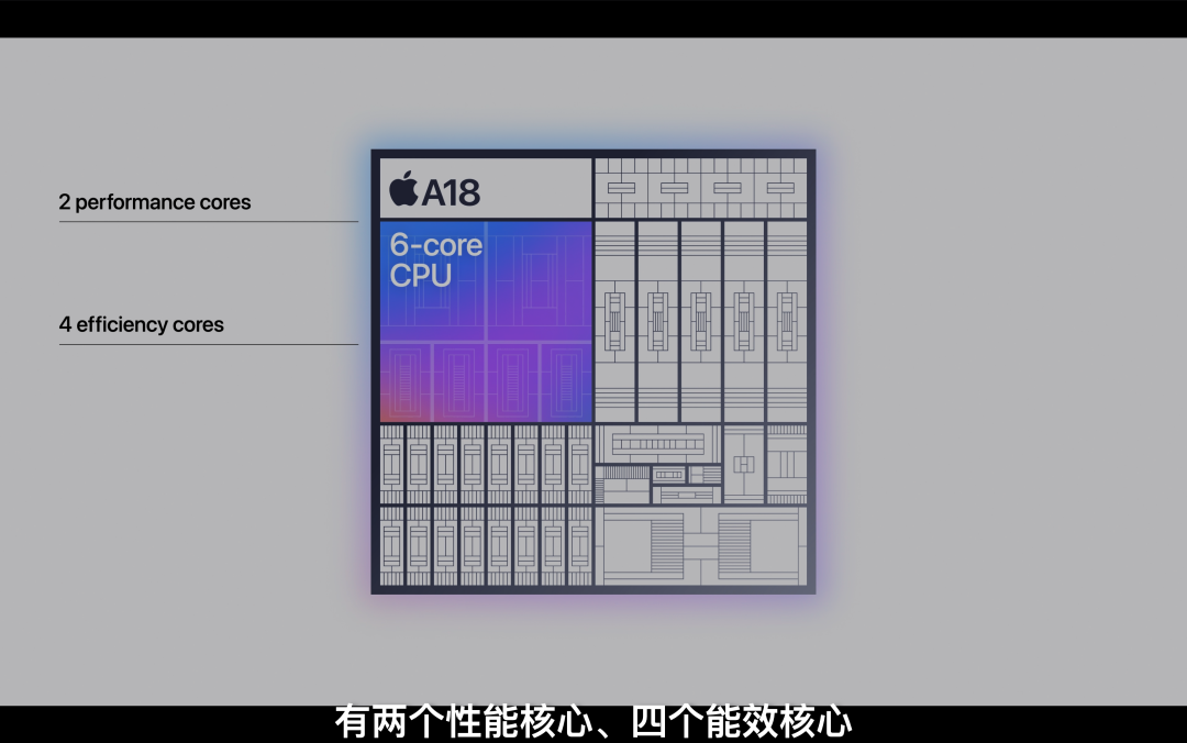 为了适应 iOS 18 AI 功能的更高硬件需求,iPhone 16 配备了全新A18 芯片。这款 3nm 制程工艺芯片采用 6 核心 CPU(2P+4E)、5 核心 GPU 和 16 核心 NPU。