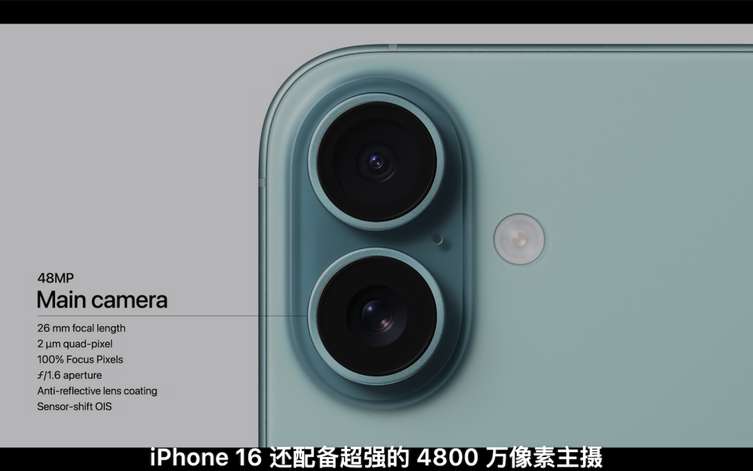 影像配置方面,主摄像头为 48MP 26mm 广角相机,可通过主摄裁切的方式实现 12MP 52mm 的 2× 长焦相机。广角相机为 12MP 13mm 相机,且 Apple 终于将广角相机微距模式下放到 iPhone 16 中,这也是 iPhone 16 相对 iPhone 15 在相机方面的“巨大提升”。另外,iPhone 16 可拍摄空间视频。
