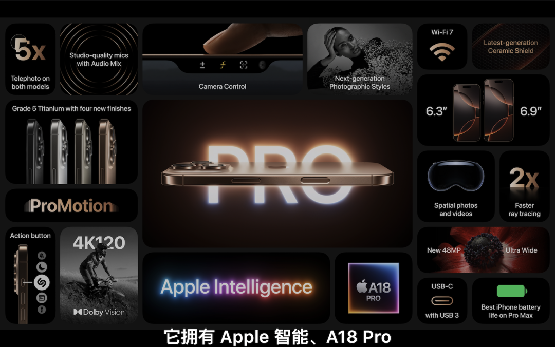 相机方面,iPhone 16 Pro 采用了三摄像头方案,分别为 48MP 26mm 广角摄像头、48MP 13mm 超广角摄像头和 12MP 120mm 潜望摄像头。其中 48MP 广角摄像头采用了第二代 48MP 方案,响应速度和读写速度有大幅提升。基于 A18 Pro 的 AI 能力,iPhone 16 Pro 提供了更多的相机色彩风格。