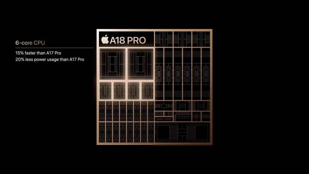 并且,A18 拥有 6 核 CPU,包含 2 个性能核心和 4 个效率核心,比 iPhone 15 中的 CPU 快 30%,而在同等性能下,功耗可以减少 30%。