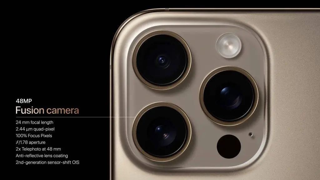 长焦镜头这边,iPhone 16 Pro 看齐 Pro Max 版本,用上了同款「四重反射棱镜长焦」镜头, 支持 5 倍光学长焦,像素保持 1200 万,光圈为 f/2.8。