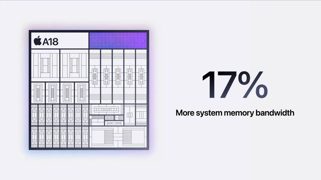 相比于去年在 A17 Pro 上使用的 N3B 工艺,今年第二代 3 纳米工艺在提升能效方面有着更大的优势。神经引擎速度提升两倍,内存子系统升级,带宽增加 17%。