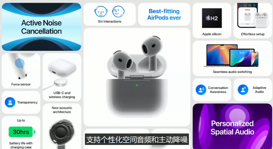 以及在 AirPods 4 基础上,苹果还推出首款开放式降噪的 AirPods 4,支持主动降噪、通透模式、自适应音频。