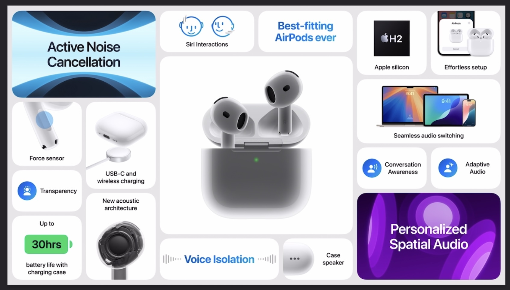 AirPods 4,搭载全新A2芯片,配备了个性化空间音频,同时增加机器学习功能,让Siri能够识别摇头、点头和对提示的响应。