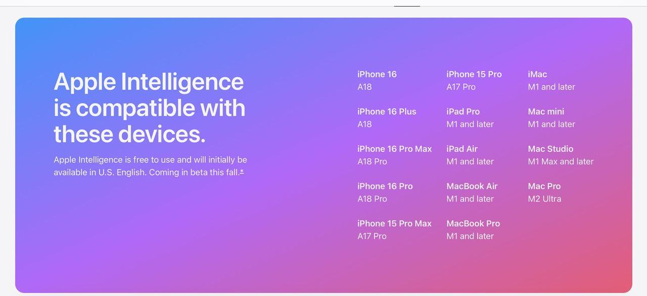 在苹果官网,他们也附上了未来可以体验到”苹果AI“的设备:
