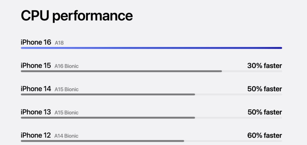 在芯片方面,此次标准版搭载了全新的 A18 处理器,采用第二代 3nm 工艺,CPU 为 6 核心,包括 2 个性能核心和 4 个效率核心。苹果表示,CPU 性能要比 iPhone 15 的 CPU 快 30%,比 iPhone 12 的 A14 快 60%。