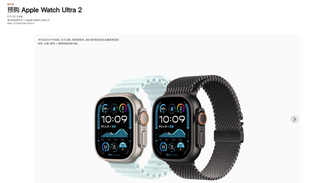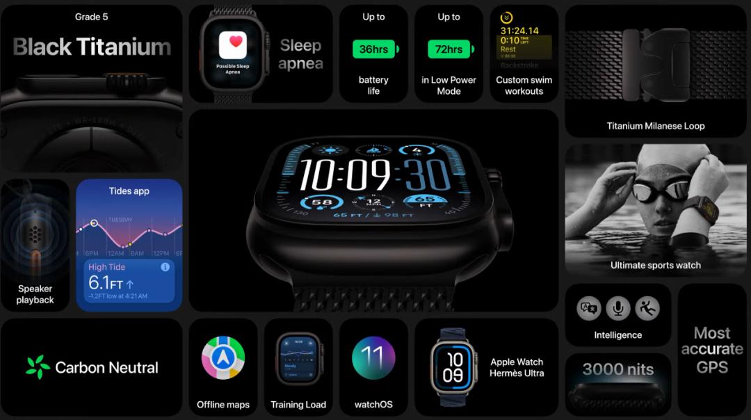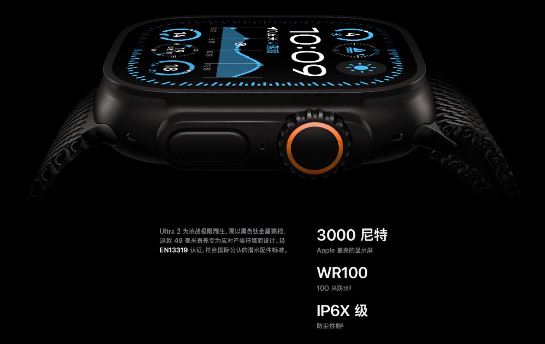 备受期待的 Apple Watch Ultra 3 缺席了这次发布会。Ultra 2 新增全新黑色钛金属表壳。它不仅满载日常所需的各种连接、健康和安全功能,更配有运动手表中精准度超高的 GPS。