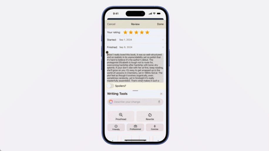 语言方面,iPhone 配置了智能化的文本工具,可帮助用户自动处理输入的文本。纠错是最基本的,该工具还能让文本内容变得更加专业化、更友善或更简洁。另外,其还非常擅长处理 emoji 表情,如有需要,用户甚至可以输入自然语言来生成自己想要的 emoji 并将其发送给朋友。