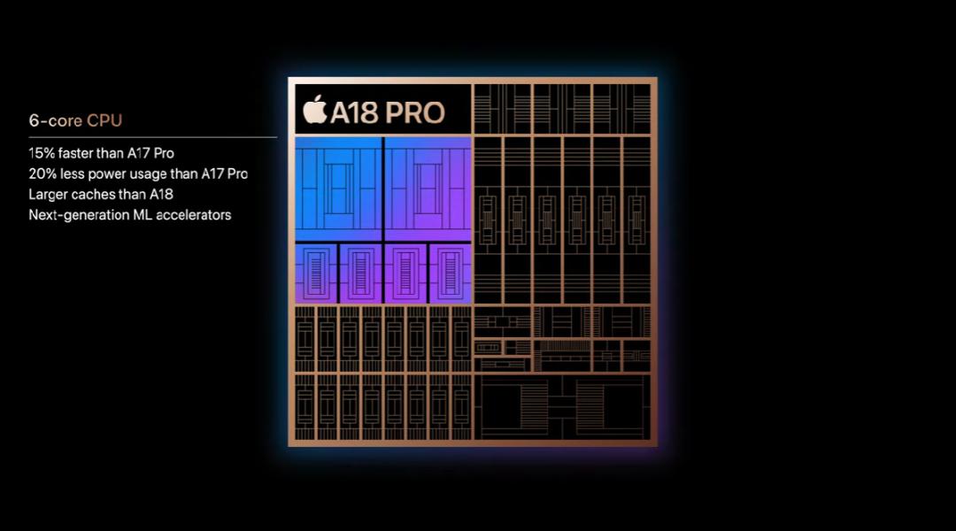 CPU 方面,A18 Pro 搭载了 6 核 CPU,包括 2 个性能核心和 4 个效率核心,速度比 A17 Pro 提升了 15%,同时功耗降低了 20%。同时比 A18 缓存更大,还支持下一代机器学习(ML)加速器。