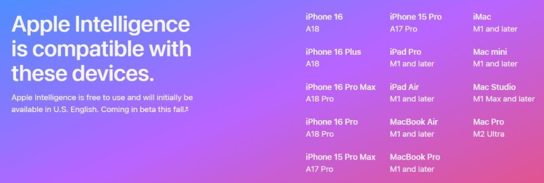 当然,不只是今天发布的 iPhone,大部分较新的苹果设备都支持 Apple Intelligence。