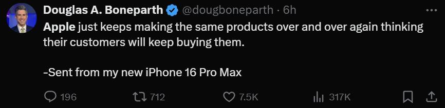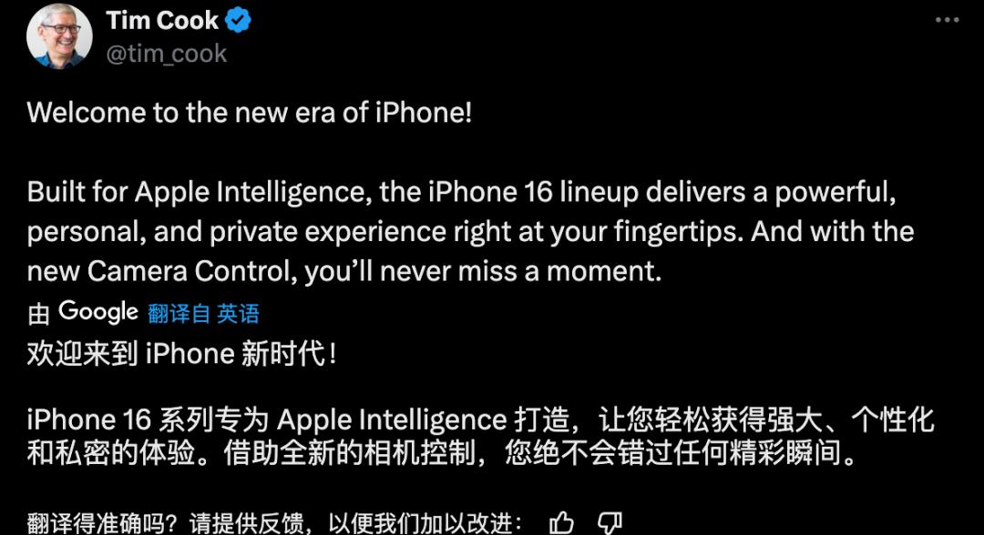 虽然发布会后苹果 CEO 蒂姆・库克发推表示新一代 iPhone 是专为 Apple Intelligence 打造的,这标志着 iPhone 已经进入了一个新时代,但整体而言,苹果此次发布的硬件和功能都未能超出人们的预期。发布会的股价表现也佐证了这一点:几乎没有变化。