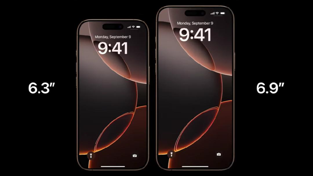 尺寸方面,iPhone 16 Pro 为 6.3 英寸,iPhone 16 Pro Max 为 6.9 英寸,后者成为苹果有史以来最大的显示屏。最大屏幕的同时边框也实现了迄今最窄,同样配备了灵动岛功能、ProMotion 自适应刷新率技术,屏幕刷新率最高 120 Hz、原彩显示、2000 尼特峰值亮度。
