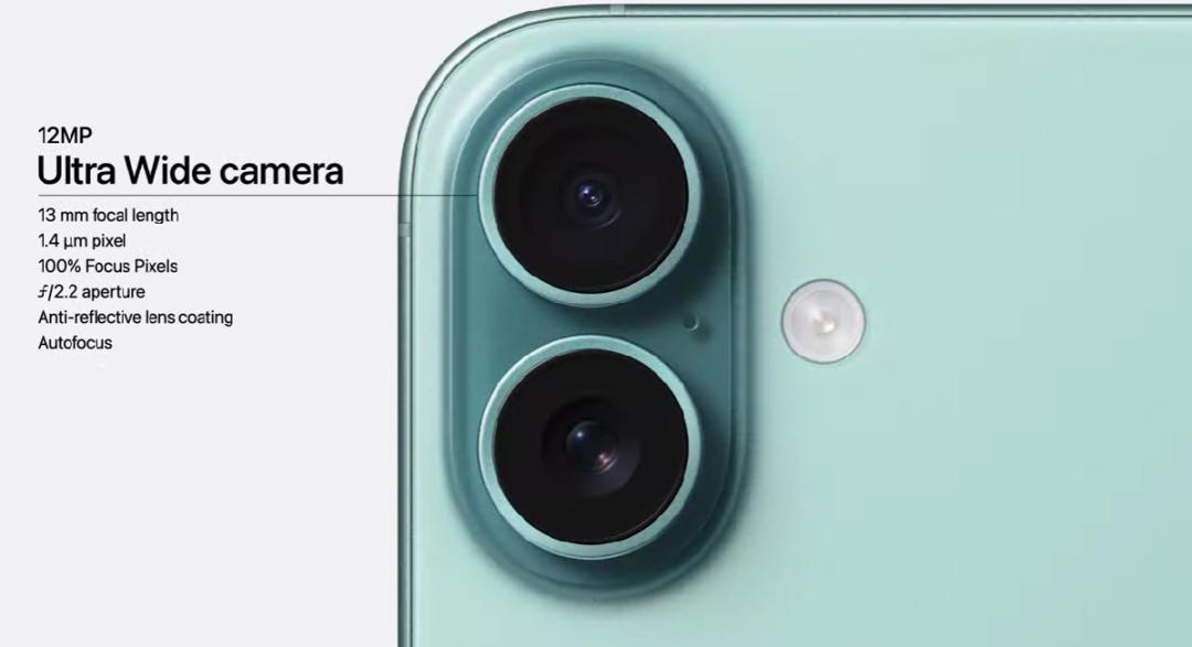 第二颗同样是 4800 万像素超广角摄像头,支持 13 毫米焦距、ƒ/2.2 光圈和 120° 视角、Hybrid Focus Pixels 以及超高分辨率照片(4800 万像素),同时支持自动对焦。
