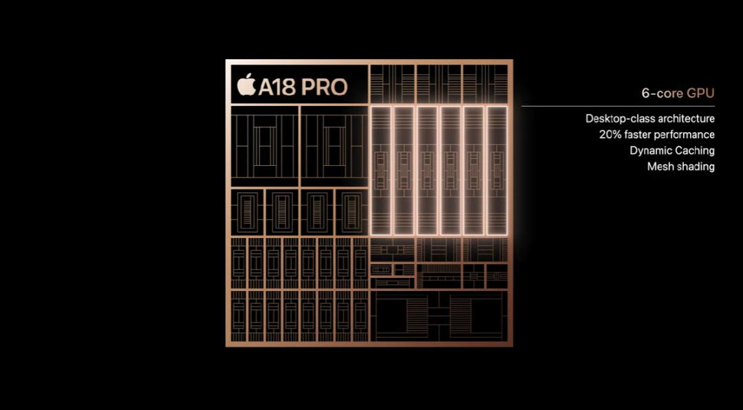 GPU 方面,A18 Pro 采用了桌面级架构,搭载了 6 核 GPU,性能比 A17 Pro 提升了 20%,支持网格着色功能,光线追踪速度是 A17 Pro 的两倍。