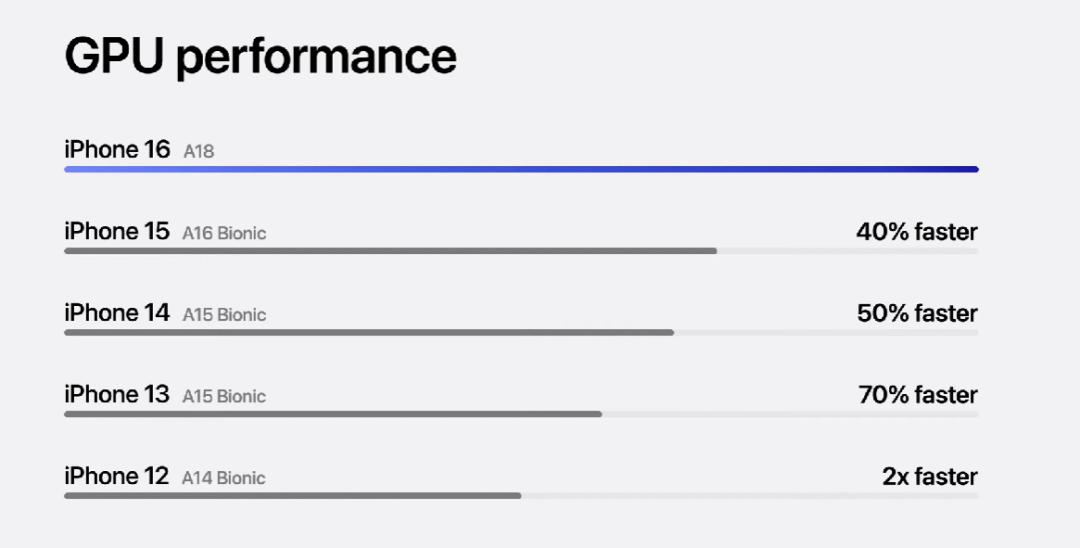 GPU 方面,A18 搭载的 5 核 GPU 性能比 iPhone 15 的 A16 快了 40%,同时能耗降低了 35%。