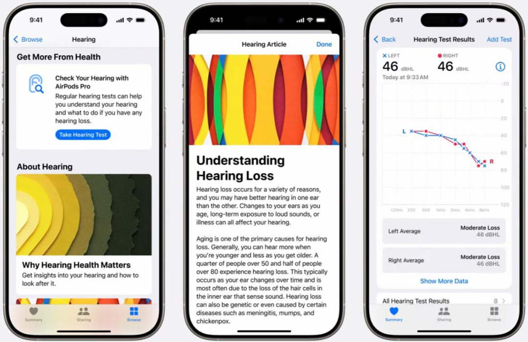 为了帮助用户检查听力,苹果很快将在健康应用程序中提供经过临床验证的听力测试。使用交互式纯音听力测试,耳机将能够识别用户是否有听力损失,并提供详细的摘要,突出显示每年的听力损失程度、分类和建议。用户将能够轻松地与医生分享这些结果并采取适当的措施。