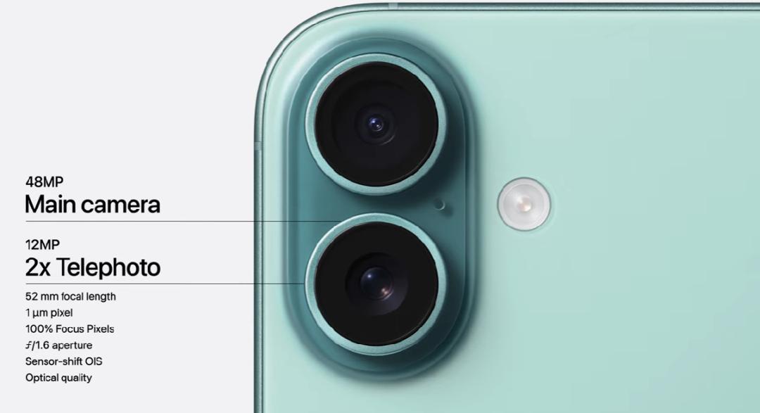 在相机方面,标准版采用双摄系统,主摄 4800 万像素,支持 26 毫米焦距、ƒ/1.6 光圈、传感器位移式光学图像防抖功能、100% Focus Pixels、以及超高分辨率照片(2400 万像素和 4800 万像素)。主摄同时支持 1200 万像素 2 倍长焦功能。