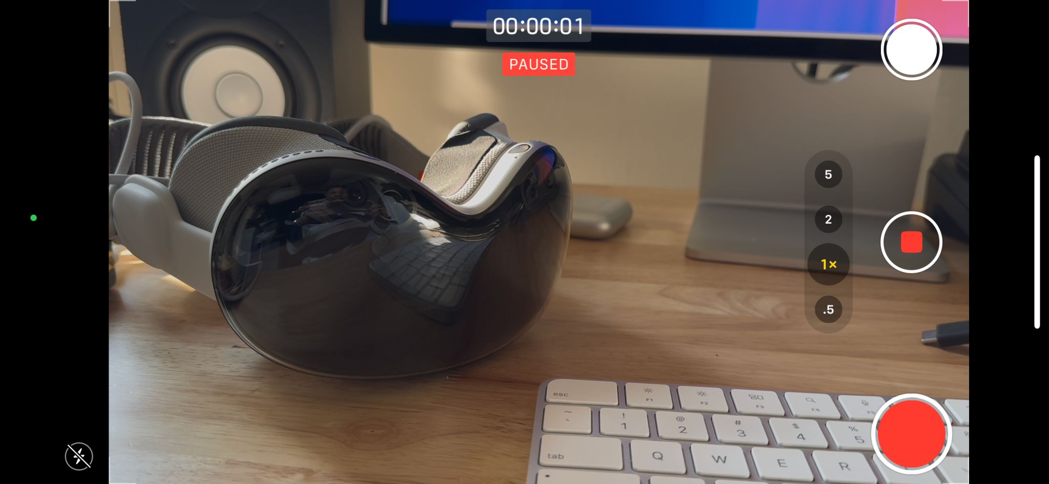 用户暂停录制视频之后,会在用户界面顶端、录制时间正下方看到一个“暂停”指示符。此外,暂停按钮会转变为录制按钮,以表明按下后将恢复录制。