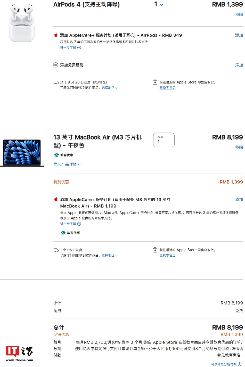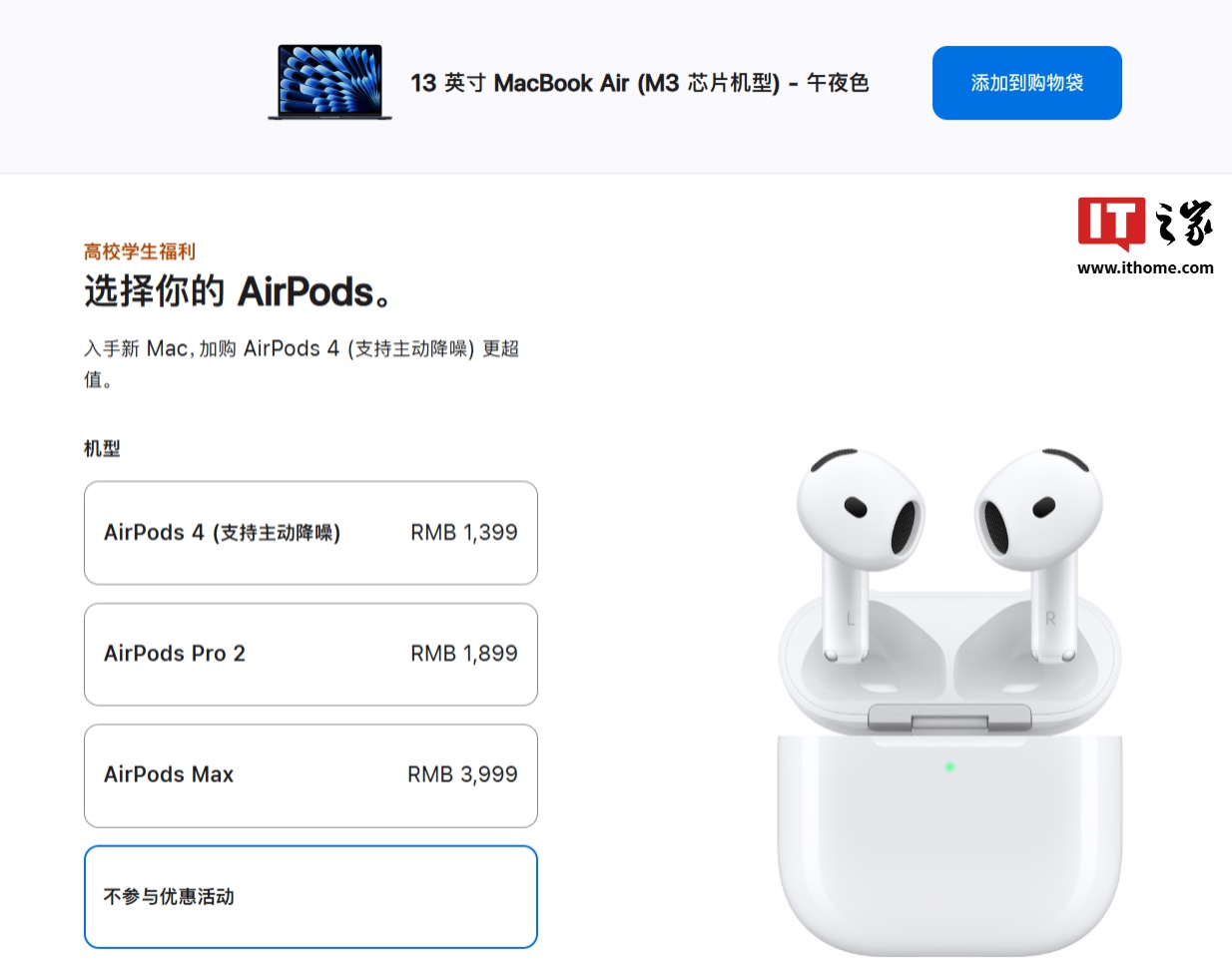 IT之家注意到,苹果 AirPods 4 降噪版已支持参与教育优惠活动,购买 Mac 电脑可选择加购,在结账时将自动抵扣耳机价格 1399 元。