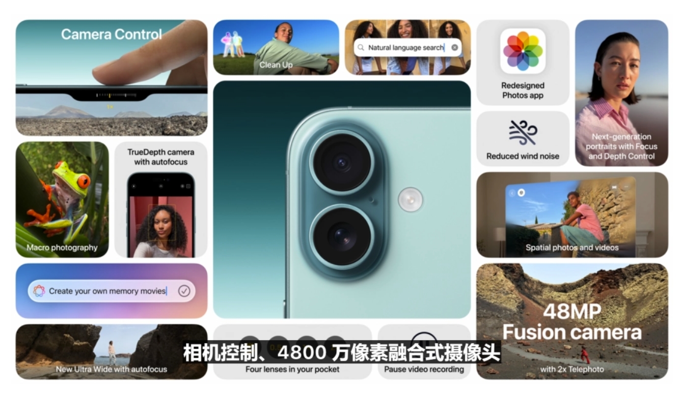 影像上,iPhone 16配备48MP Fusion相机,4800万像素主摄和1200万像素广角镜头,可以将4800万像素的超高分辨率图像与1200万像素融合,得到2400万像素高清图像。