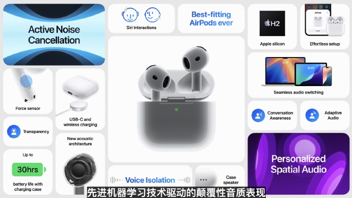 搭载 Apple H2 芯片,采用新的声学架构,支持个性化的空间音频。