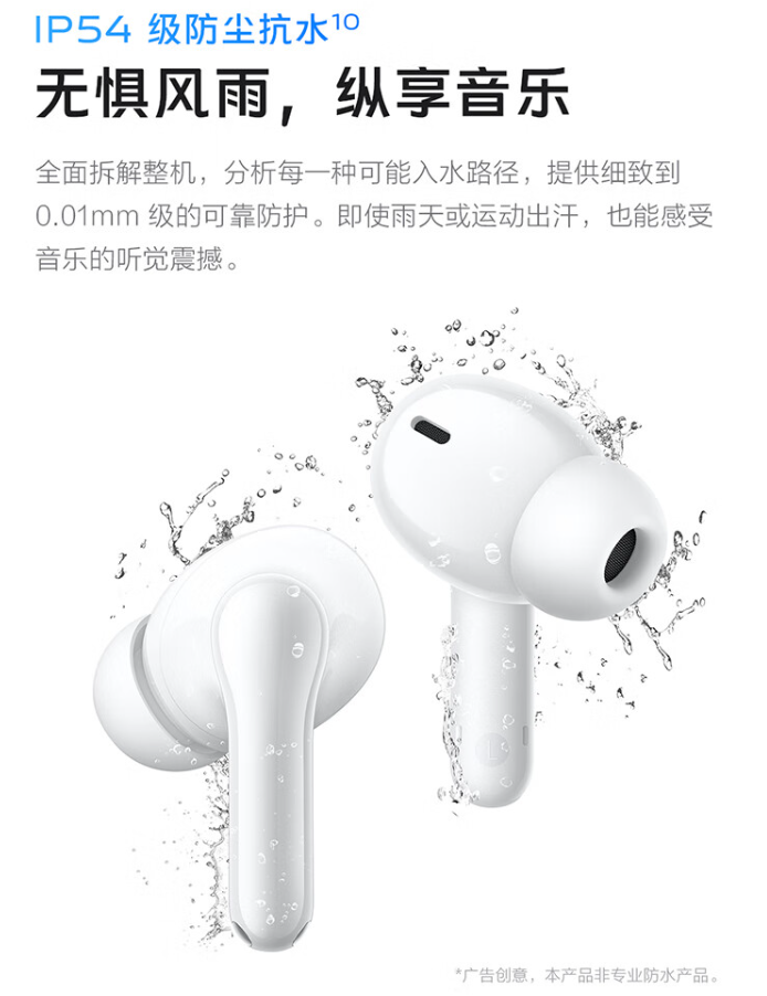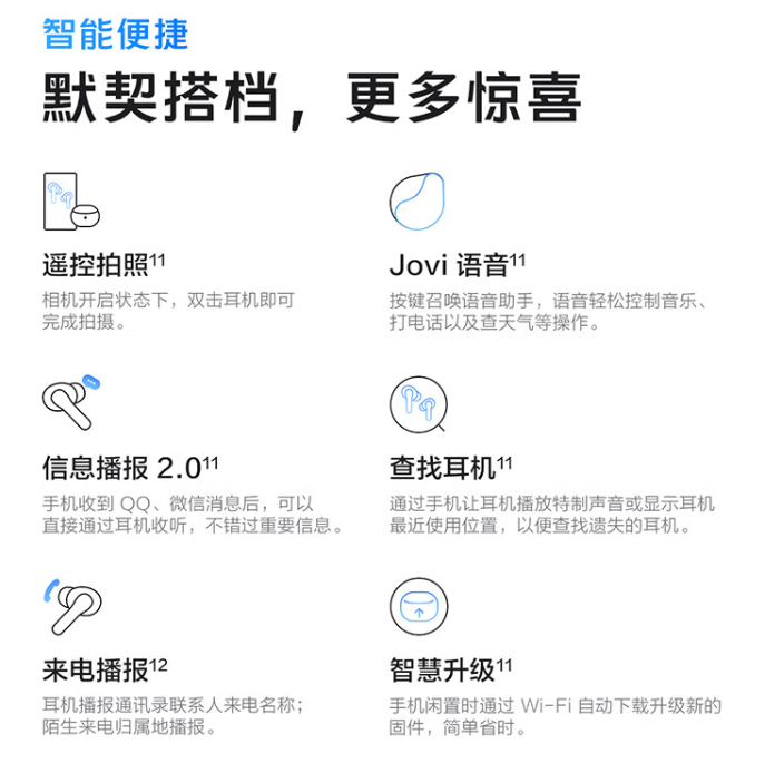 vivo TWS 3i 无线耳机还支持 IP54 级防尘抗水,提供遥控拍照、Jovi 语音、信息播报 2.0、查找耳机、来电播报等功能。