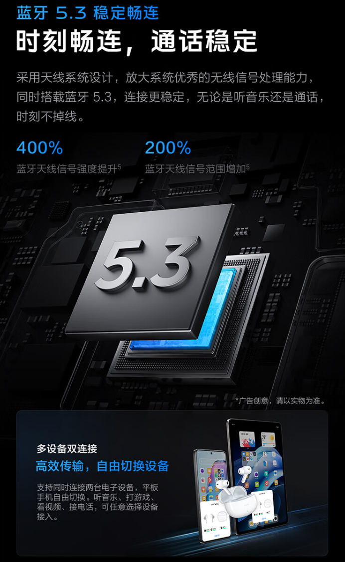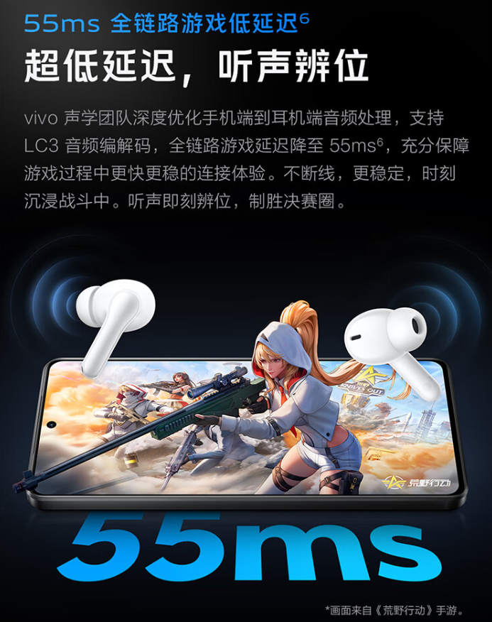 该耳机配备 10mm 声音单元,频响范围 20Hz~20kHz,拥有四种声音风格;支持 AI 通话降噪、3D 全景音频功能;支持 LC3 音频编解码,全链路游戏延迟降至 55ms。