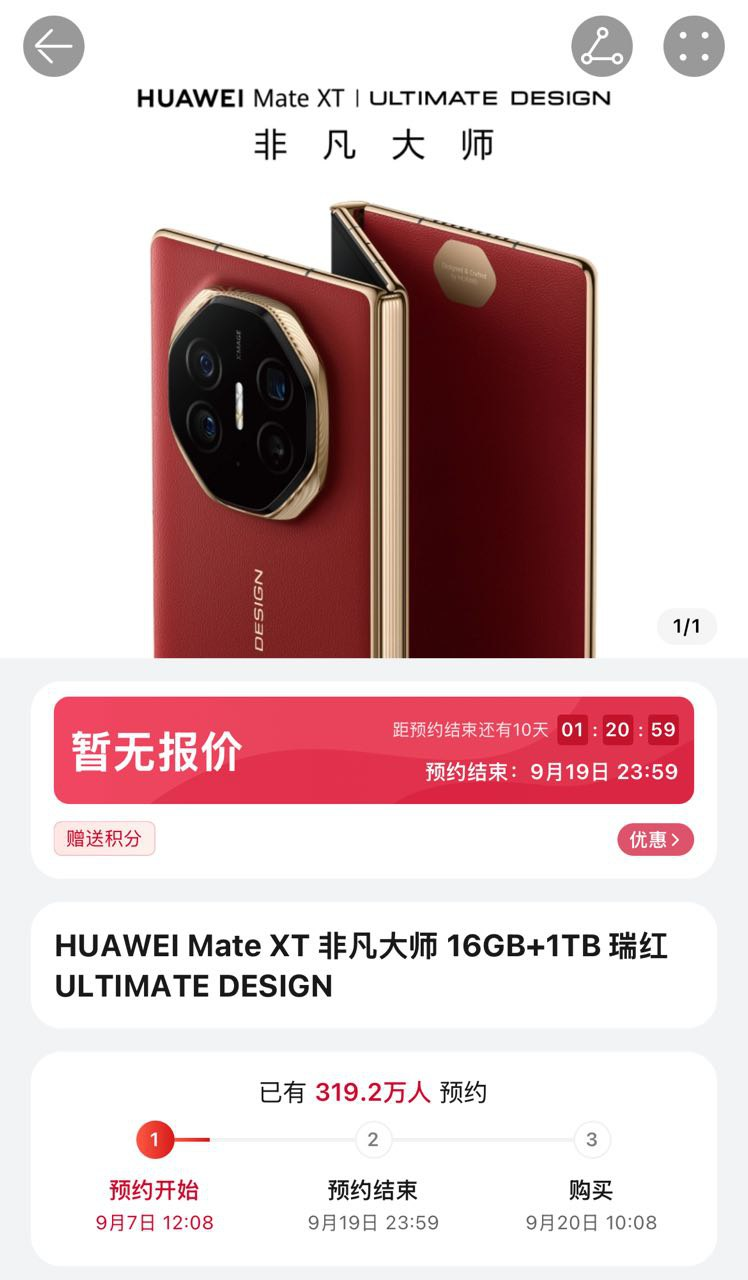 华为 Mate XT 非凡大师三折叠手机提供瑞红、玄黑两款配色,以及 16GB+1TB、16GB+512GB 两个存储版本,将于 9 月 20 日 10:08 正式开售。