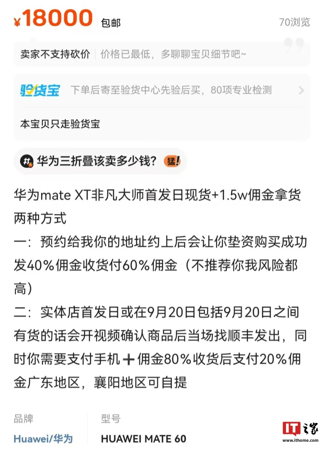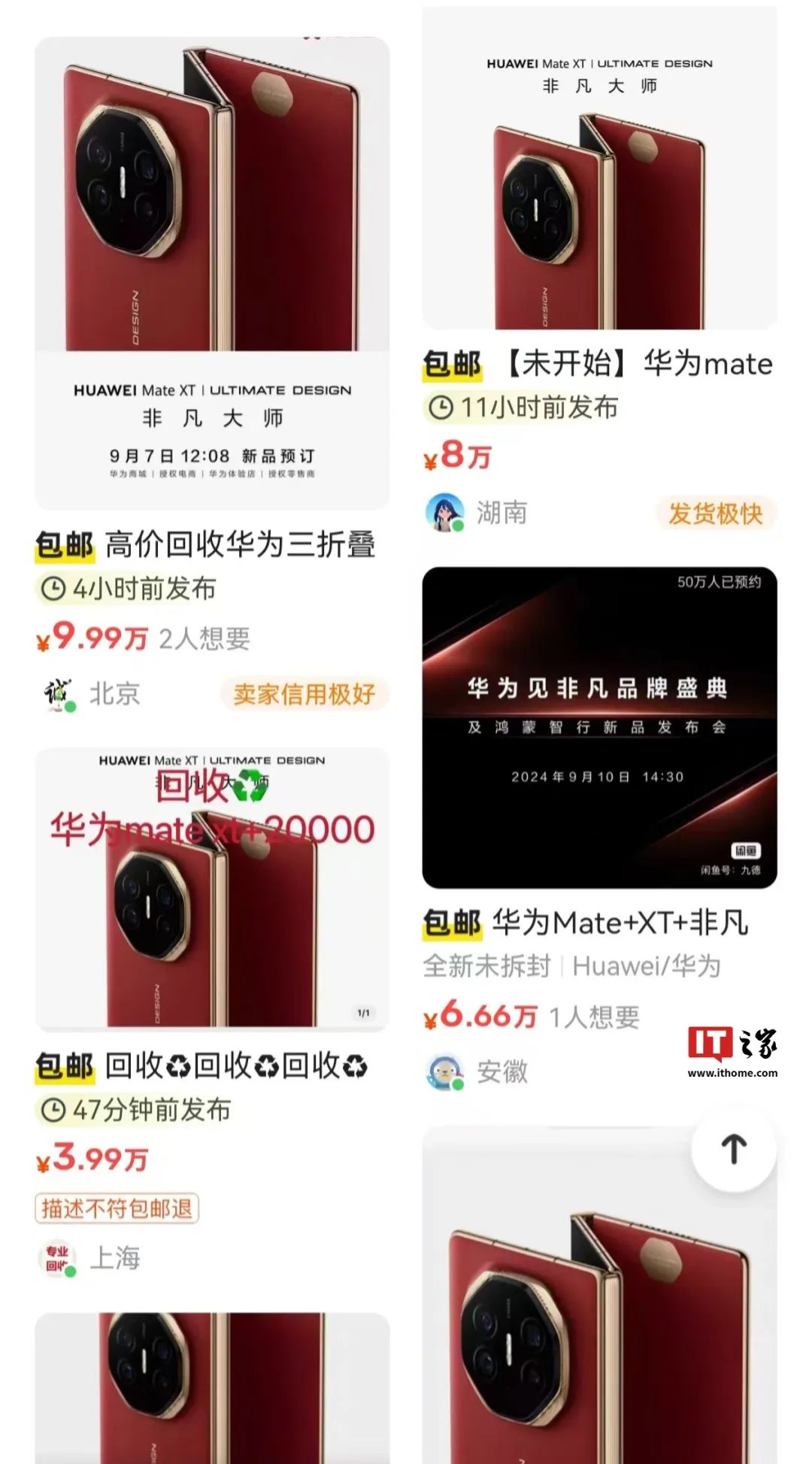 不仅如此,黄牛也蠢蠢欲动,二手平台已出现“高价收购”华为 Mate XT 非凡大师三折叠手机的“用户”。
