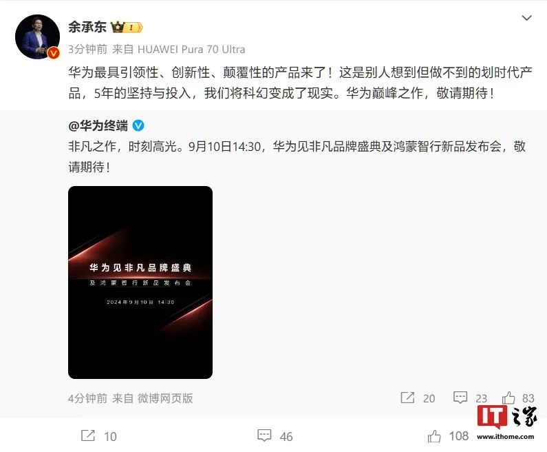 发布会日期官宣之后,余承东随即发文预热,放话:“华为最具引领性、创新性、颠覆性的产品来了!这是别人想到但做不到的划时代产品,5 年的坚持与投入,我们将科幻变成了现实。华为巅峰之作,敬请期待!”
