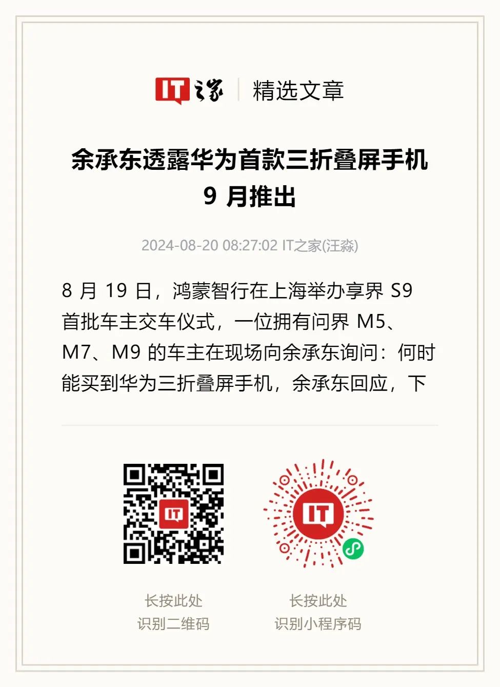 其五,在享界 S9 首批车主交车仪式中,余承东被问及何时能买到三折叠屏,回答“下个月,到 9 月份”。