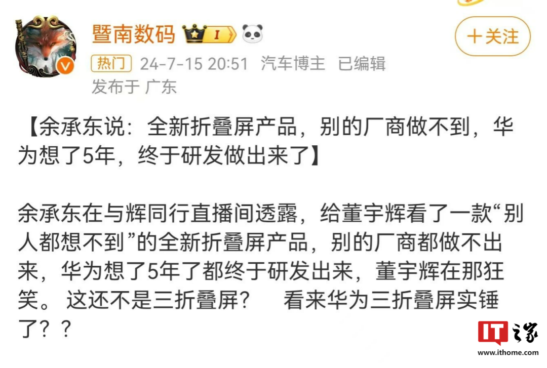 其三,在 8 月,网传的一张余承东被偷拍的照片显示,他手持一台三折叠屏新机。