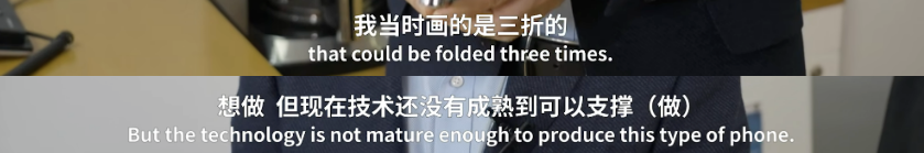 在 @和之梦放送 的《华为的 100 张面孔》纪录片第三集中,华为李小龙透露他早年画了一部三折叠屏手机,但当时的技术还没有成熟。