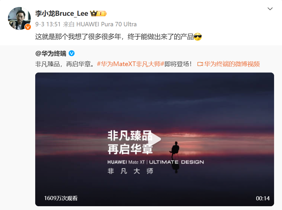 Mate XT 非凡大师手机开启预热之后,李小龙也直言,这就是那个他想了很多很多年,终于能做出来了的产品。