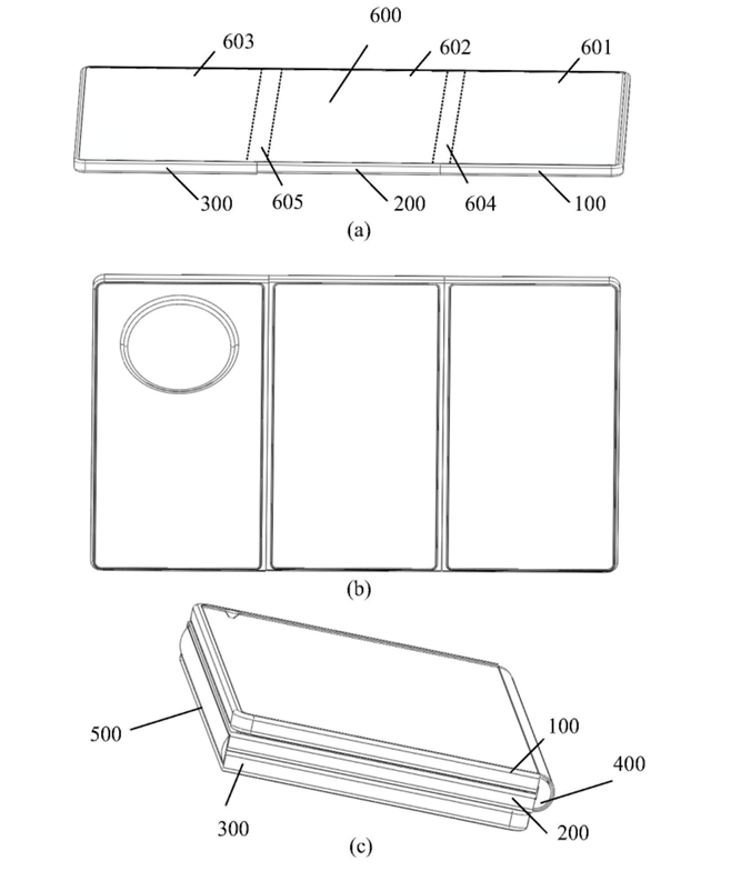 其一,在 3 月,华为公布了“折叠屏设备”专利,专利图显示为一款三折叠屏手机。