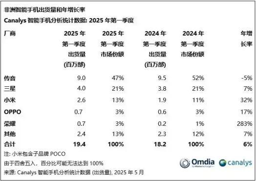 传音对非洲市场极高的重视程度,让它连续多年稳占市场第一,分析机构Canalys的数据显示,2025年第一季度,传音在非洲市场的出货量已经达到了900万部,占据了47%的市场份额。