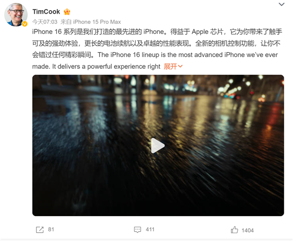 对于自家新机的发布,库克也是第一时间发文:“iPhone 16 系列是我们打造的最先进的 iPhone。得益于Apple芯片,它为你带来了触手可及的强劲体验,更长的电池续航以及卓越的性能表现。全新的相机控制功能,让你不会错过任何精彩瞬间。”