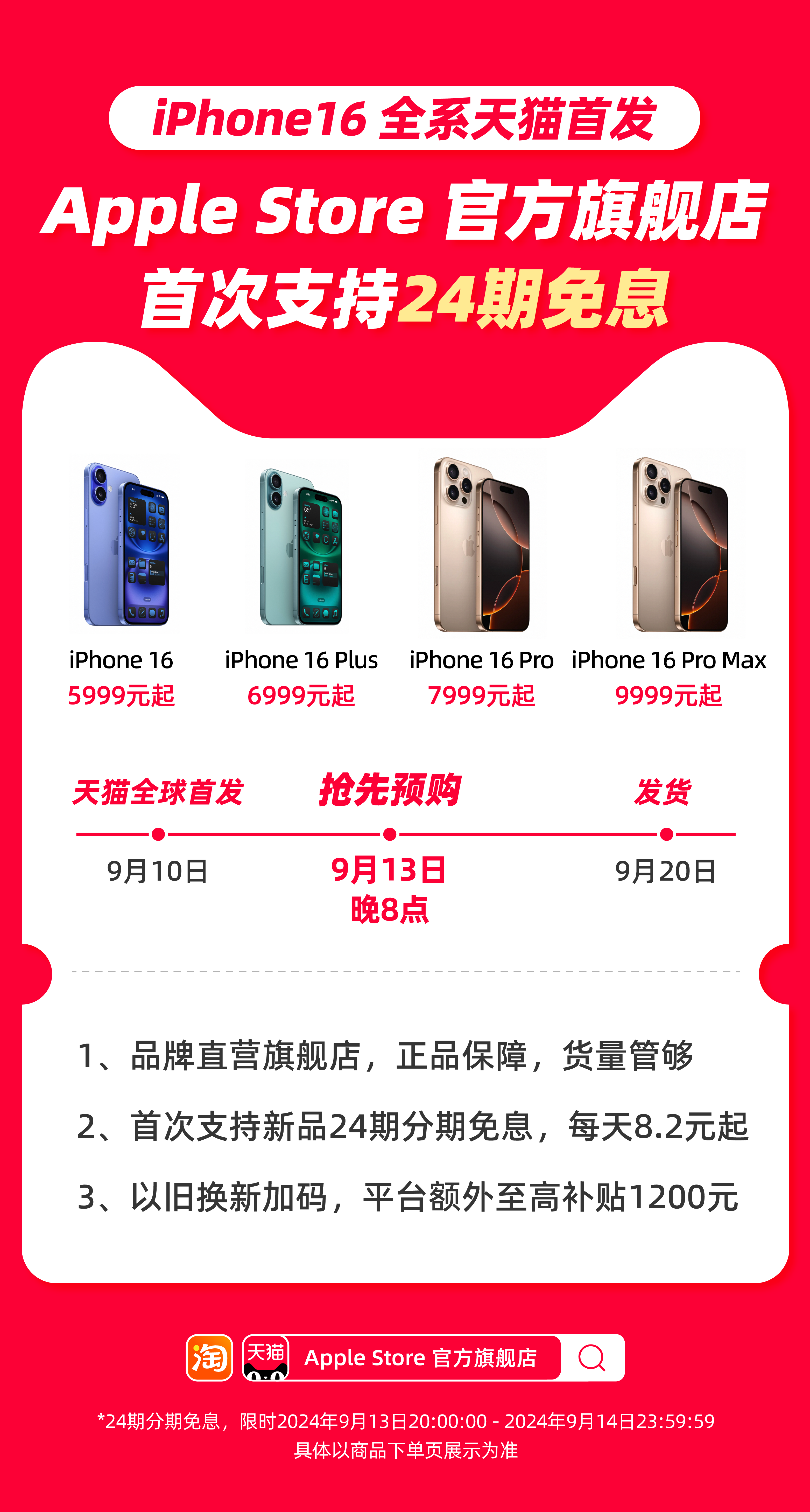 此外,今年苹果新品首发期间,消费者通过以旧换新购买新iPhone,天猫额外至高补贴1200元。为了让消费者更快拿到iPhone16,淘宝小时达联合全国近3000家“Apple 授权专营店”,由本地门店发货,最快小时达。