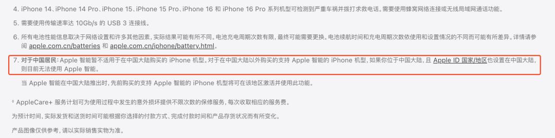 除了部分英语国家,包括中国在内的其他语言地区暂时都还无缘 Apple 智能。苹果中国的 iPhone 预定界面上显示着一行小字,“Apple 智能暂不适用于在中国大陆购买的 iPhone 机型。”苹果称,Apple 智能的推出时间依监管部门审批情况而定。