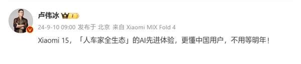 值得注意的是,卢伟冰刚刚发文表示:“Xiaomi 15,「人车家全生态」的AI先进体验,更懂中国用户,不用等明年!”