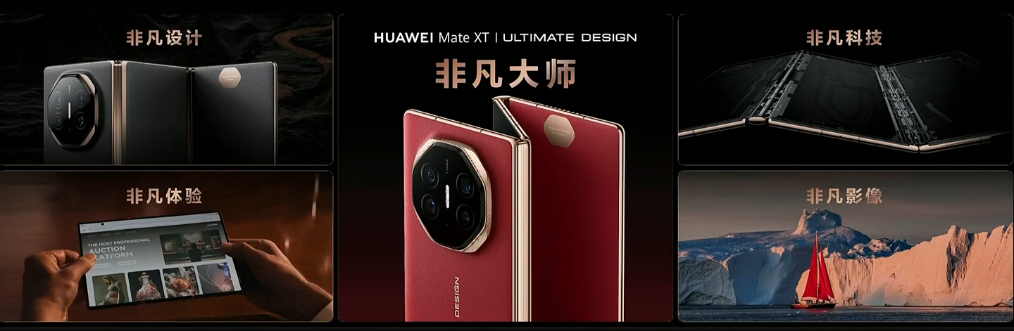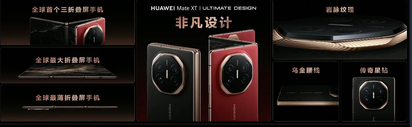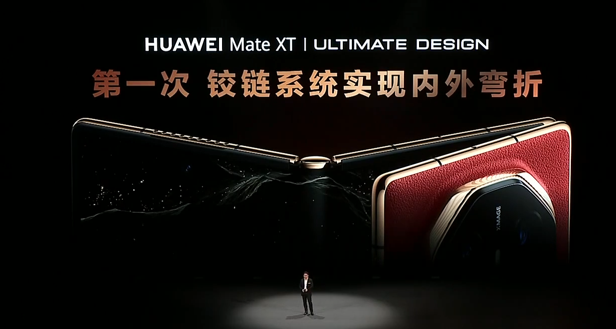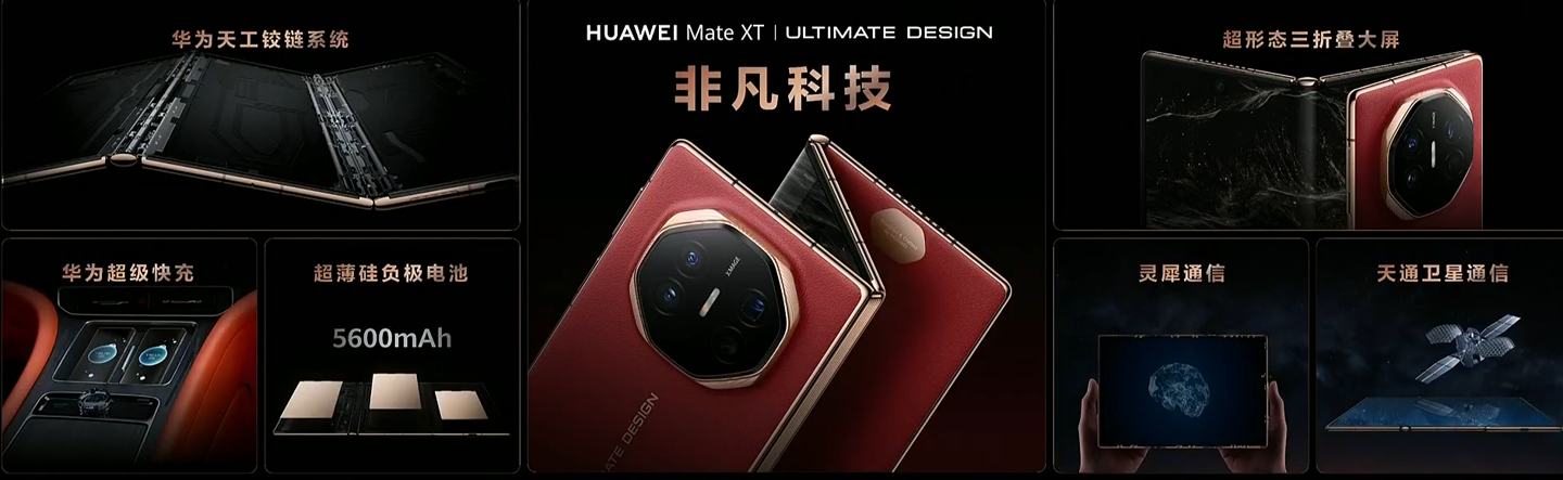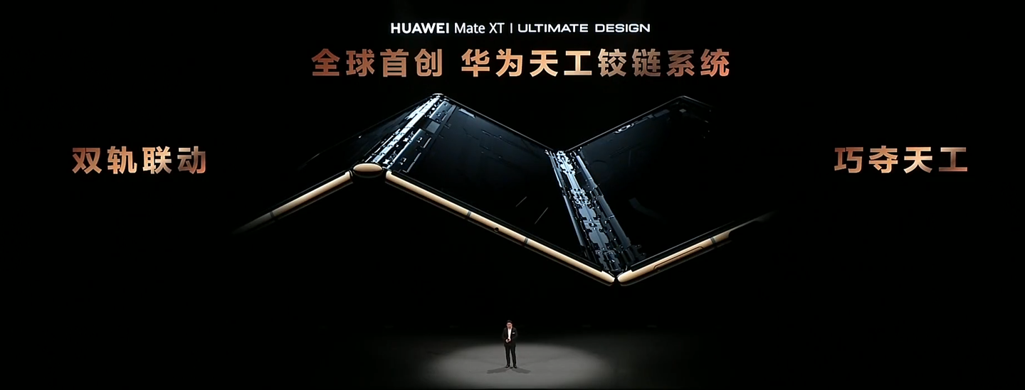 华为 Mate XT 非凡大师首次实现了铰链内外弯折,搭载“华为天工铰链系统”。