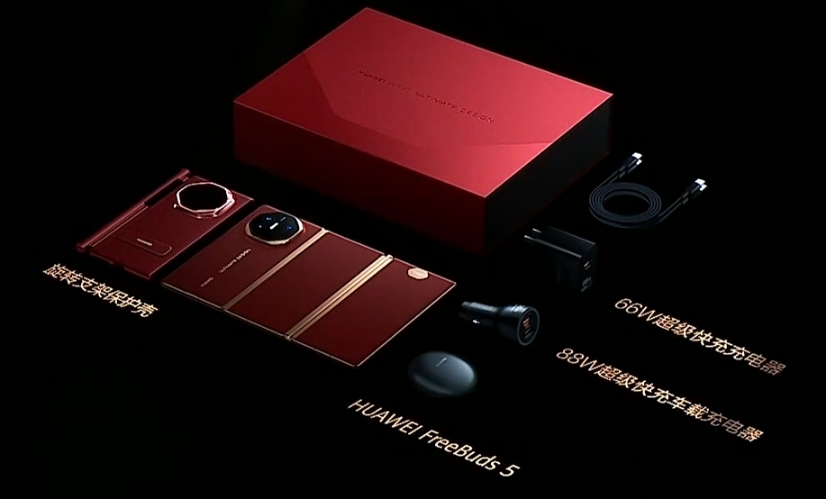 华为 Mate XT 非凡大师拥有礼盒,包括旋转支架保护壳、FreeBuds 5、88W 超级快充车载充电器、66W 超级快充充电器。