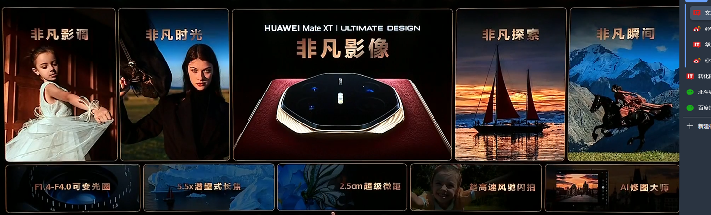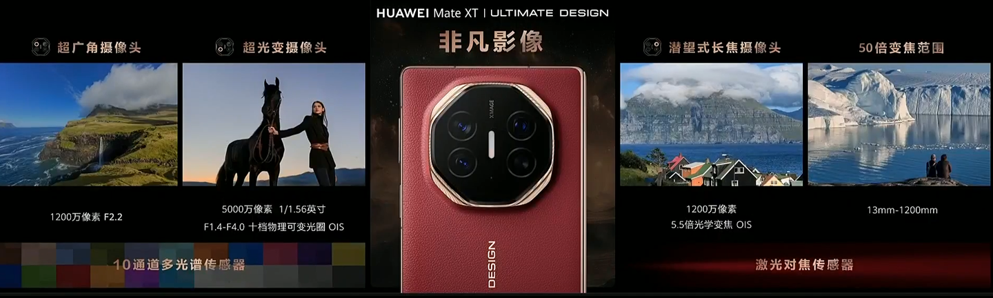 华为 Mate XT 非凡大师搭载 50MP 1/1.56" 十档可变光圈主摄(F1.4~F4.0),以及 12MP 超广角 + 12MP 潜望长焦(5.5x)后置镜头。