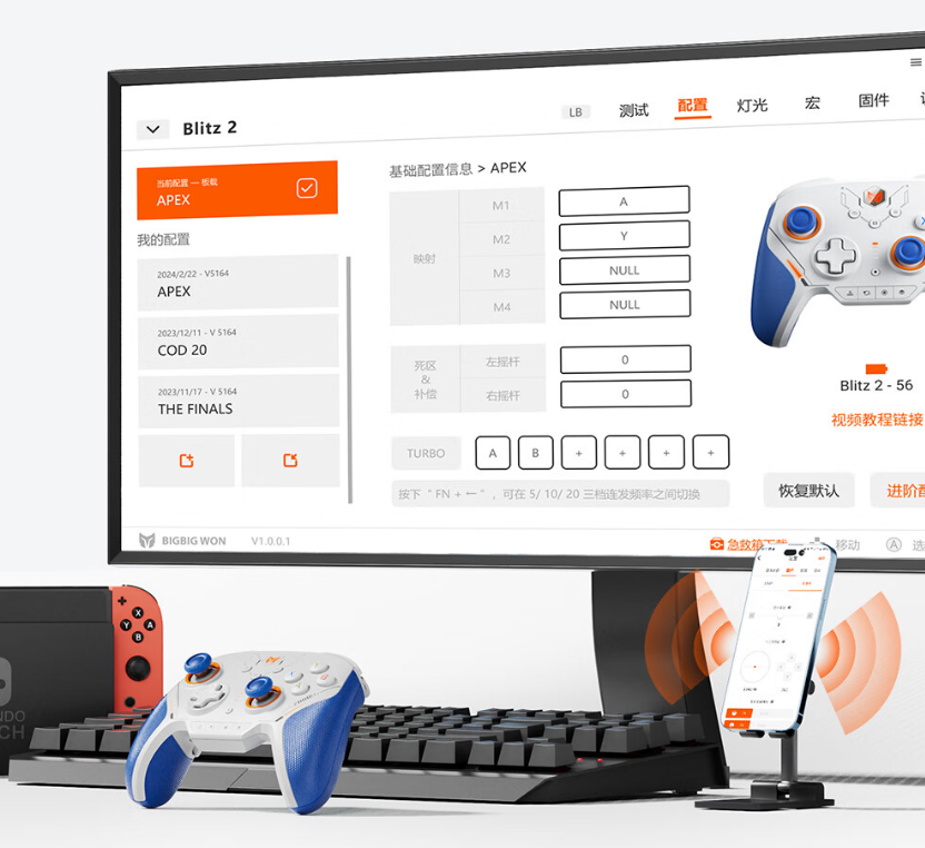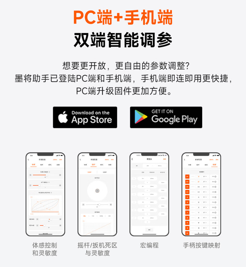 墨将官方为迅龙 2 手柄提供 PC 端和手机端(iOS + 安卓)应用,支持体感控制和灵敏度、宏编程、手柄按键映射,以及摇杆 / 扳机死区与灵敏度调节。