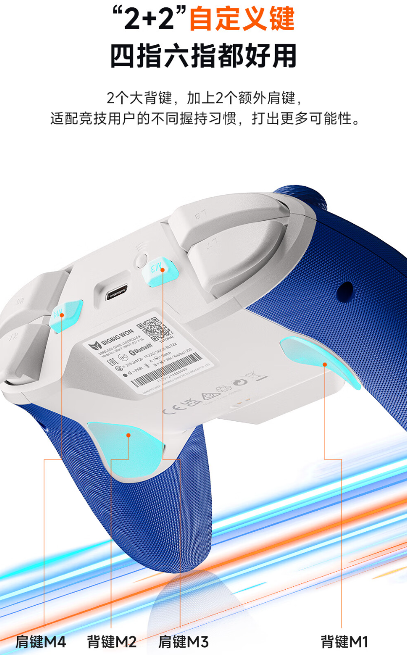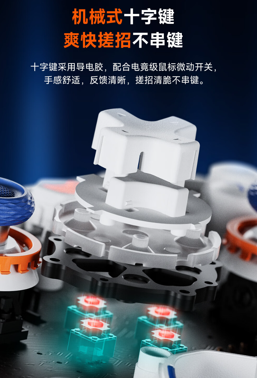 该手柄采用双层设计,在微动结构基础上增加硅胶元件;拥有 2 颗背键 + 2 颗额外肩键,支持一键连招宏等功能;手柄机械十字键采用导电胶,辅以“微动开关”,官方称“搓招清脆不串键”。