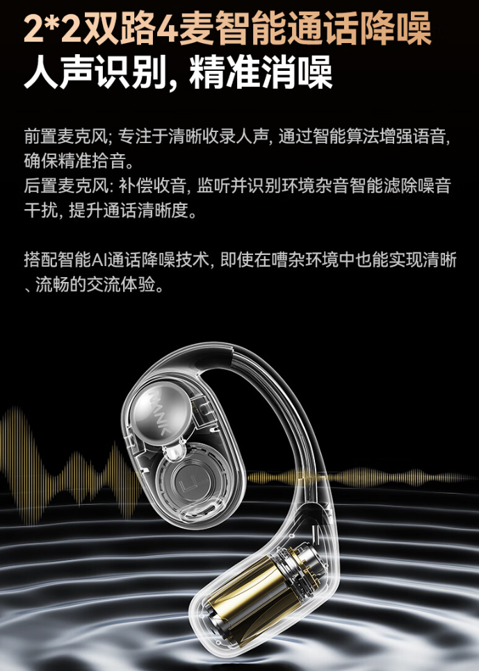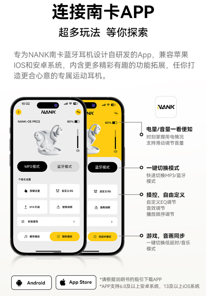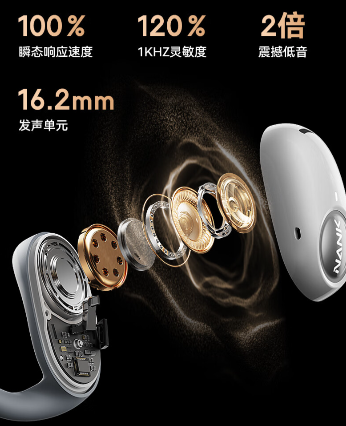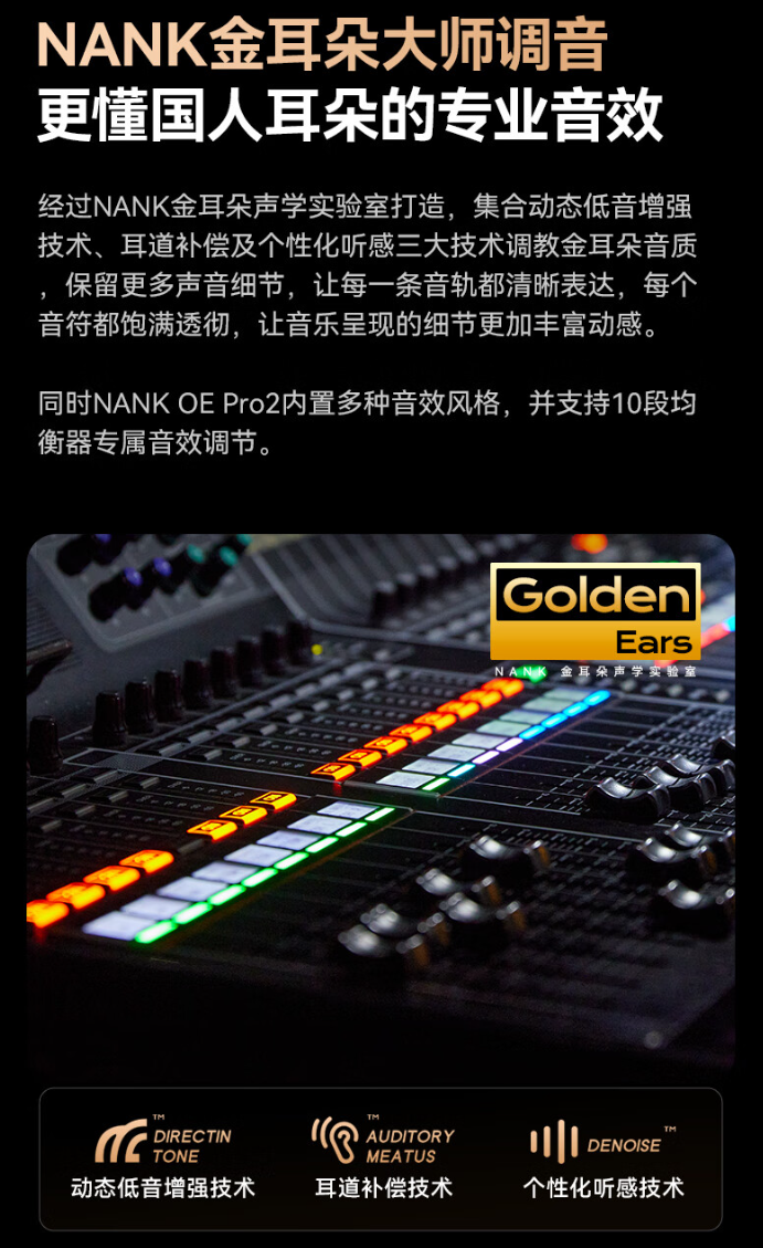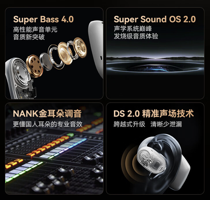 该耳机支持 DS 2.0 声场技术,采用 NANK 金耳朵调音;搭载高通芯片,支持 2*2 双路 4 麦通话降噪。官方提供 App 应用,用户可自定义 EQ 音效、查看电量等。