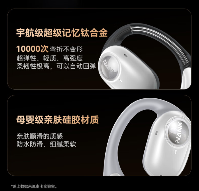 据介绍,南卡 OE Pro 2 开放式耳机配备 16.2mm 发声单元,采用 31° 悬浮倾斜设计,C 型桥使用记忆钛合金材质,同时耳机表面为硅胶材质。
