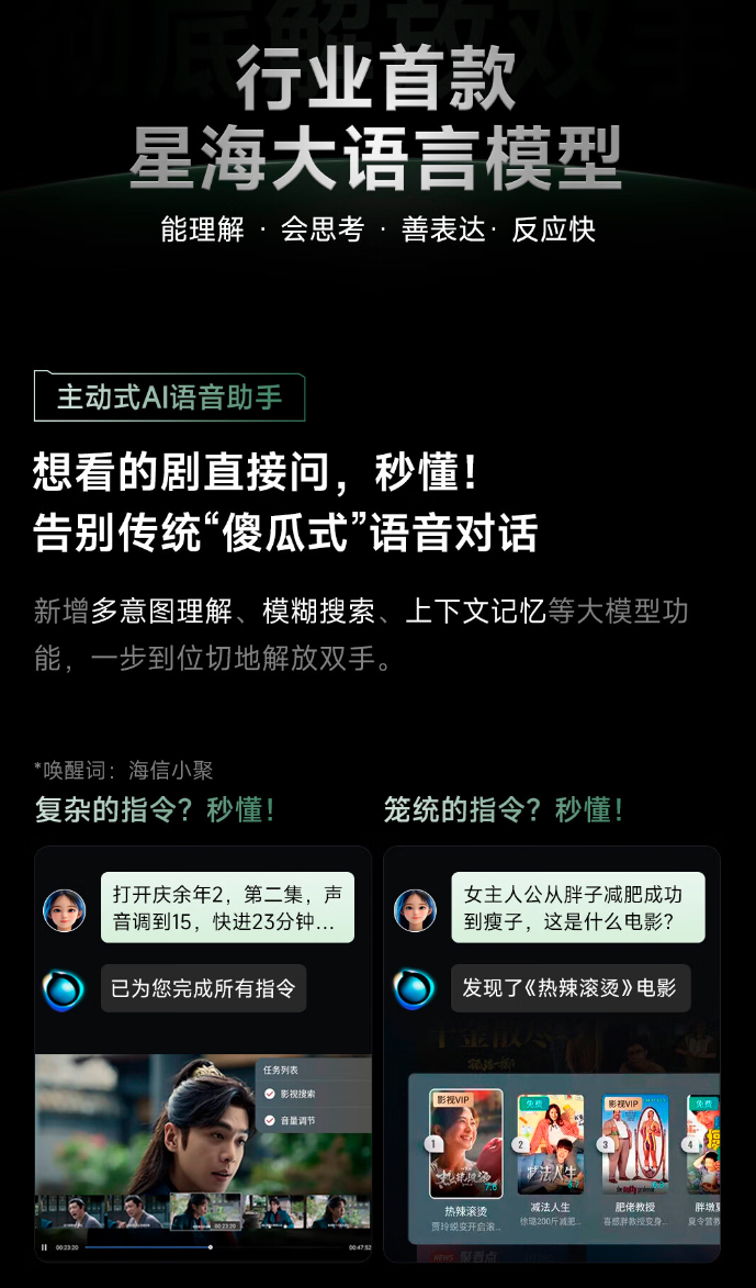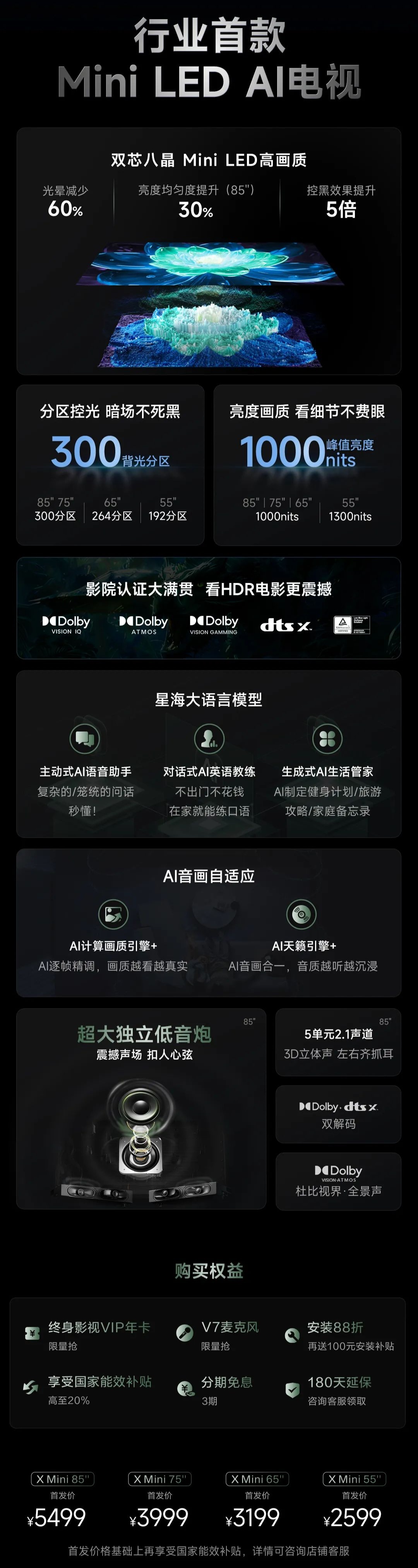 海信 Vidda AI 电视 X Mini 内置星海语言大模型,支持主动式 AI 语音助手、对话式 AI 英语教练和生成式 AI 生活管家等功能。85'' 版本配备独立低音炮,拥有 5 单元 2.1 声道,支持 Dolby・DTS X 双解码。